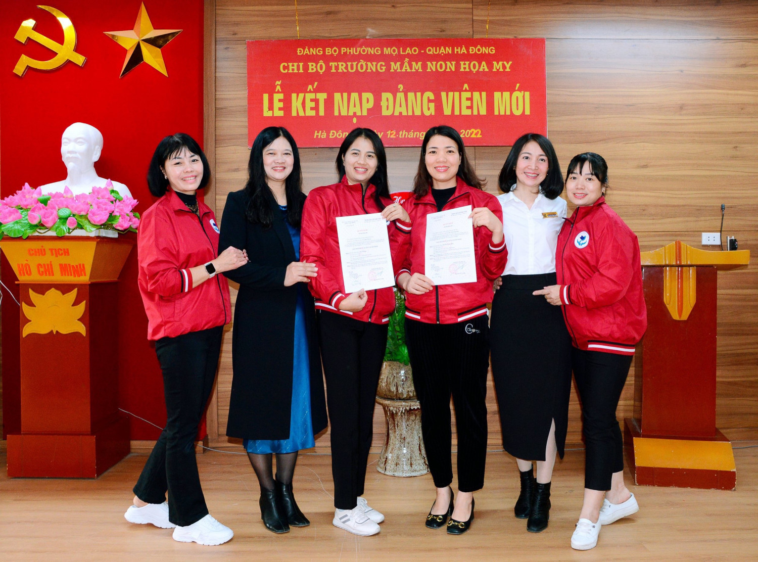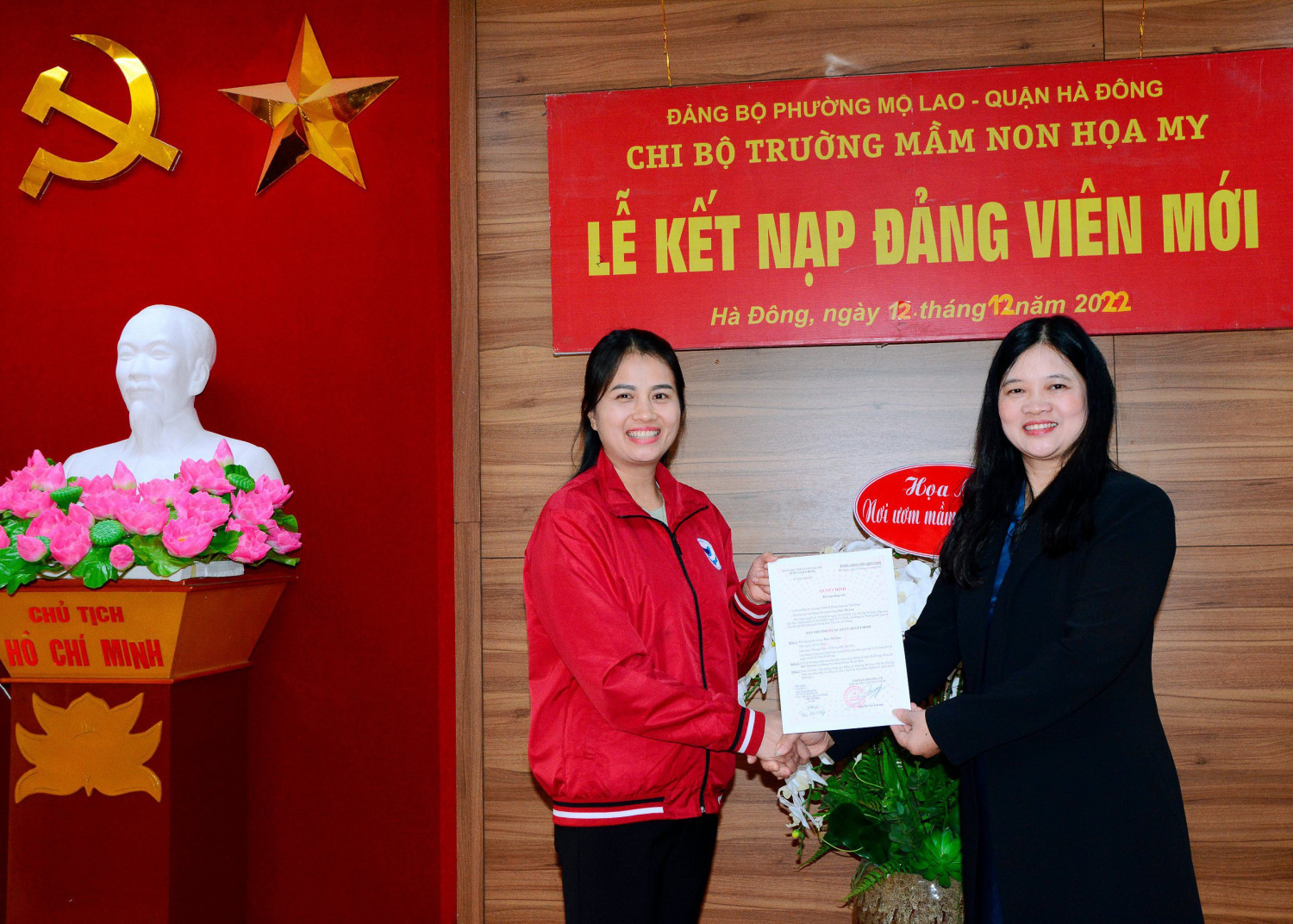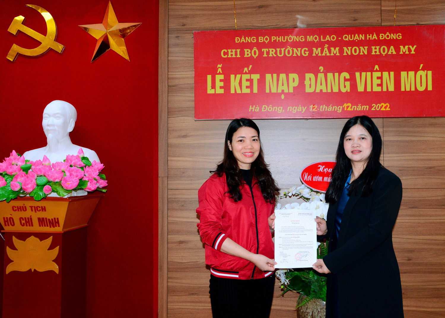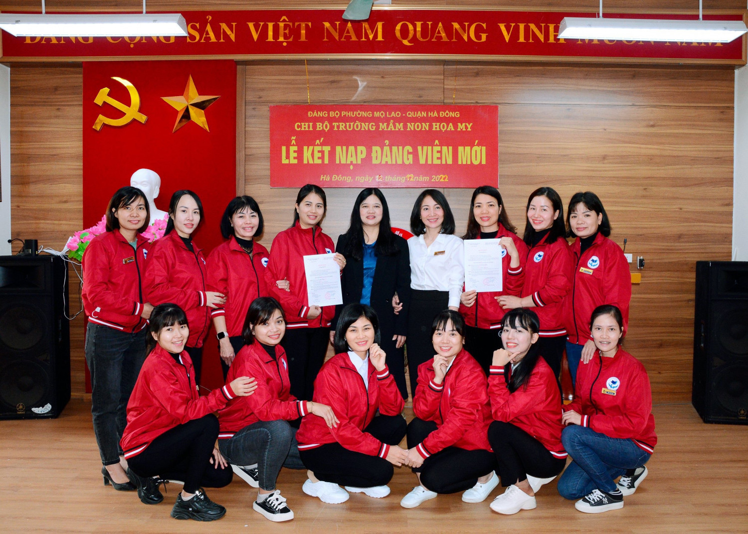 Thực hiện sự chỉ đạo của Đảng ủy phường Mộ Lao, nghị quyết Đại hội chi bộ trường MN Họa My nhiệm kỳ 2022-2025 về việc phát triển Đảng viên. Trải qua quá trình tu dưỡng, rèn luyện, phấn đấu và trưởng thành. Được sự dìu dắt, giúp đỡ của tập thể trường MN Họa My và các đồng chí đảng viên trong chi bộ, quần chúng Bùi Thị Chung Hiếu và quần chúngĐào Thị Lan đã tự nguyện xin gia nhập Đảng cộng sản Việt Nam. Được sự nhất trí của Ban chấp hành Đảng ủy Phường Mộ Lao, Ngày 12/12/2022 Chi bộ trường MN Họa My đã tổ chức kết nạp quần chúng Bùi Thị Chung Hiếu và quần chúngĐào Thị Lanvào Đảng Cộng Sản Việt Nam. Trong không khí trang nghiêm khi nhận quyết định từ đồng chí Bí thư Chi bộ, dưới cờ Tổ quốc, cờ Đảng và chân dung Chủ tịch Hồ Chí Minh cùng sự chứng kiến của Chi bộ, đồng chíBùi Thị Chung Hiếu và đồng chí Đào Thị Lan đã tuyên thệ lời thề của người đảng viên Đảng Cộng sản Việt Nam, hứa sẽ tiếp tục phấn đấu để luôn xứng đáng là người đảng viên gương mẫu, hoàn thành tốt mọi nhiệm vụ dược giao, góp phần xây dựng Chi bộ ngày càng vững mạnh. Sau thời gian làm việc khẩn trương, nghiêm túc, buổi lễ kết nạp Đảng viên mới đã diễn ra trang nghiêm, đúng điều lệ ĐCSVN và đã thành công tốt đẹp.