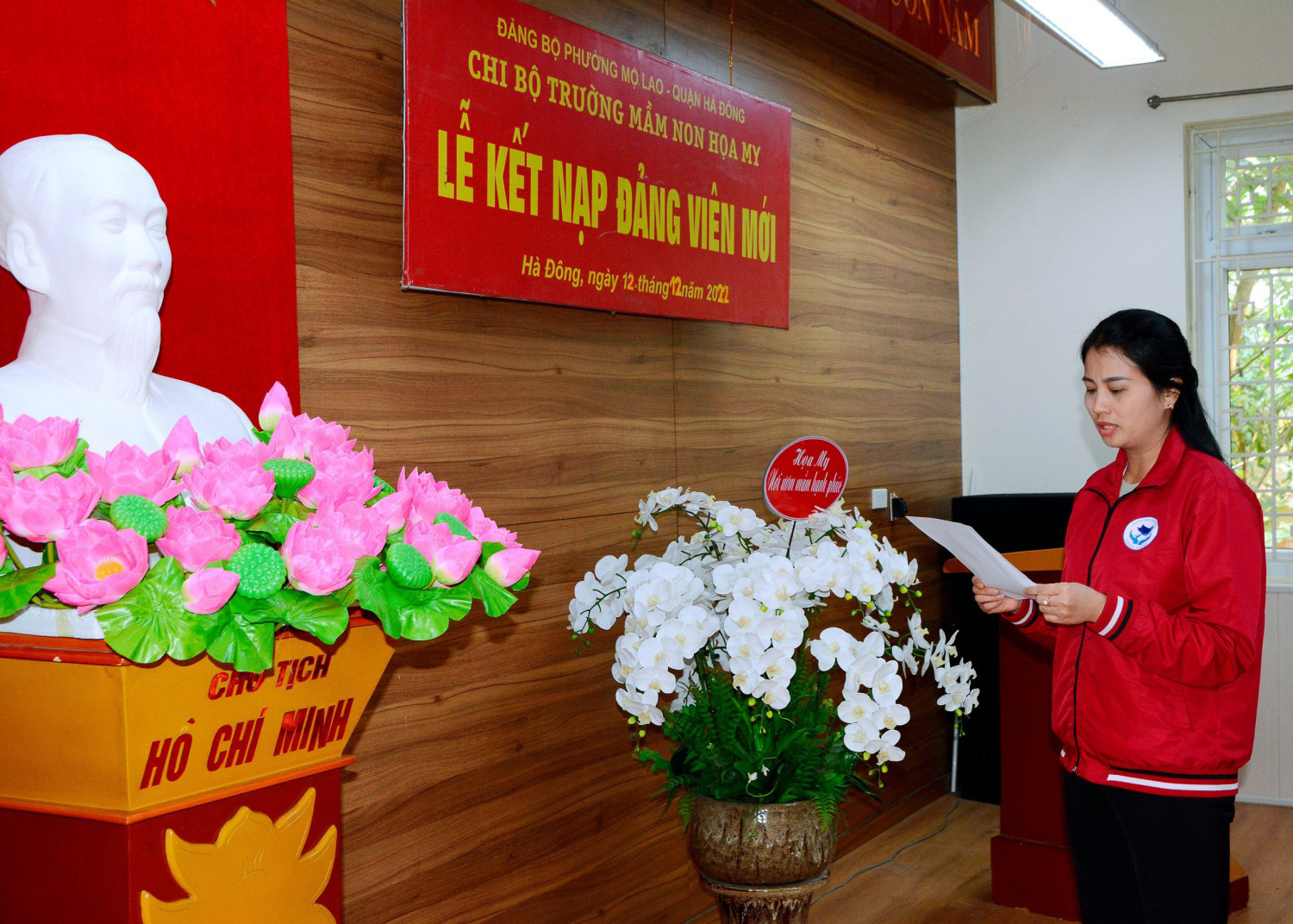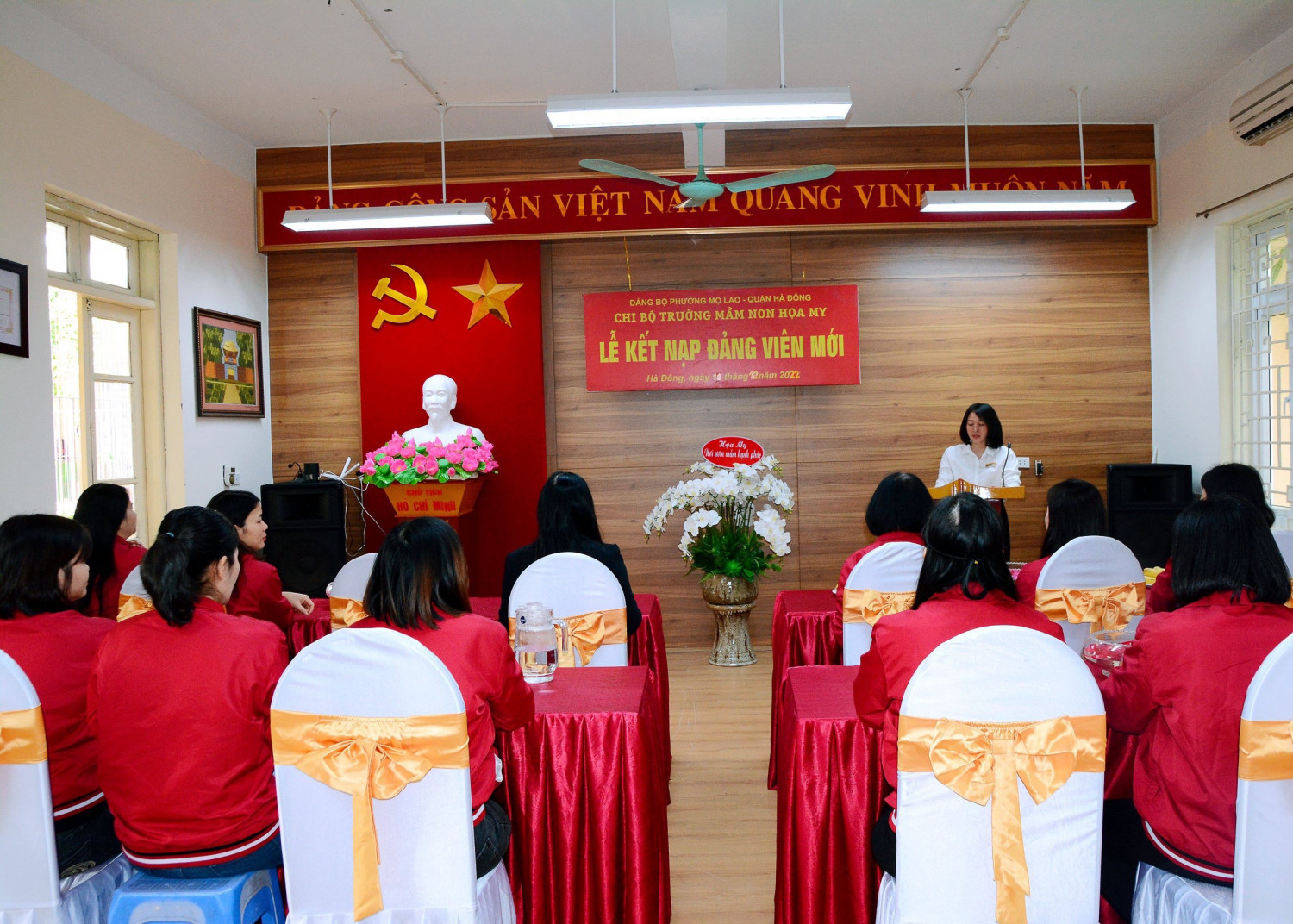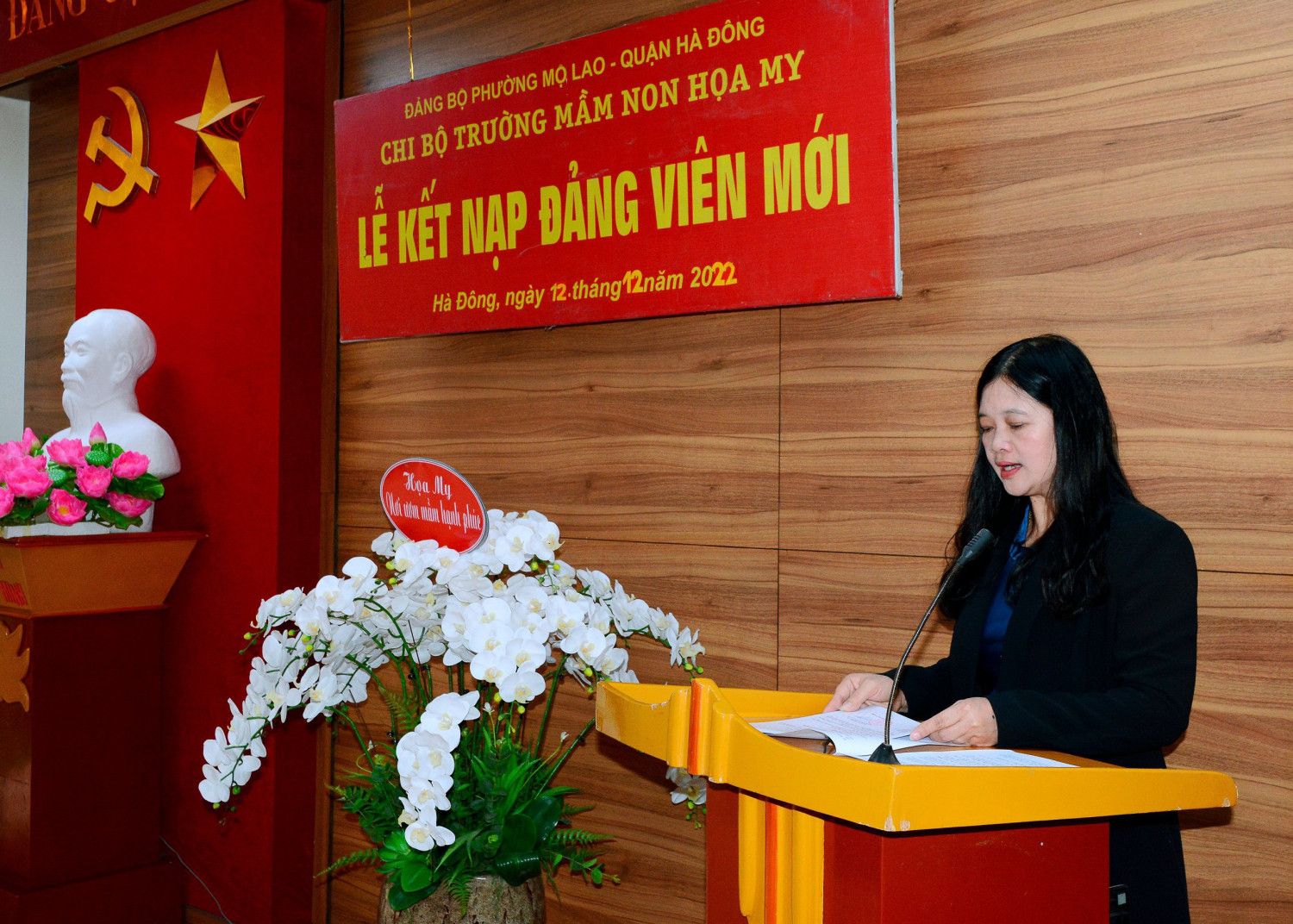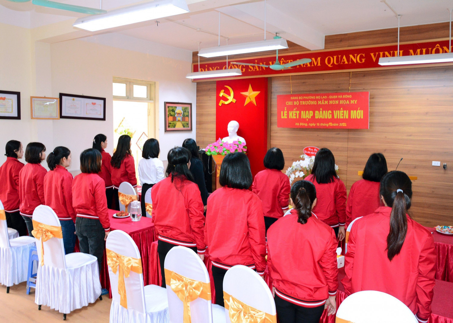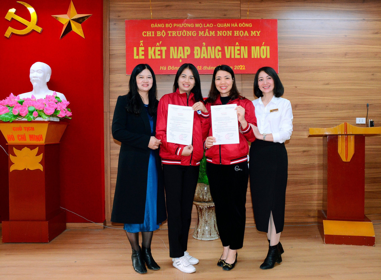 Thực hiện sự chỉ đạo của Đảng ủy phường Mộ Lao, nghị quyết Đại hội chi bộ trường MN Họa My nhiệm kỳ 2022-2025 về việc phát triển Đảng viên. Trải qua quá trình tu dưỡng, rèn luyện, phấn đấu và trưởng thành. Được sự dìu dắt, giúp đỡ của tập thể trường MN Họa My và các đồng chí đảng viên trong chi bộ, quần chúng Bùi Thị Chung Hiếu và quần chúngĐào Thị Lan đã tự nguyện xin gia nhập Đảng cộng sản Việt Nam. Được sự nhất trí của Ban chấp hành Đảng ủy Phường Mộ Lao, Ngày 12/12/2022 Chi bộ trường MN Họa My đã tổ chức kết nạp quần chúng Bùi Thị Chung Hiếu và quần chúngĐào Thị Lanvào Đảng Cộng Sản Việt Nam. Trong không khí trang nghiêm khi nhận quyết định từ đồng chí Bí thư Chi bộ, dưới cờ Tổ quốc, cờ Đảng và chân dung Chủ tịch Hồ Chí Minh cùng sự chứng kiến của Chi bộ, đồng chíBùi Thị Chung Hiếu và đồng chí Đào Thị Lan đã tuyên thệ lời thề của người đảng viên Đảng Cộng sản Việt Nam, hứa sẽ tiếp tục phấn đấu để luôn xứng đáng là người đảng viên gương mẫu, hoàn thành tốt mọi nhiệm vụ dược giao, góp phần xây dựng Chi bộ ngày càng vững mạnh. Sau thời gian làm việc khẩn trương, nghiêm túc, buổi lễ kết nạp Đảng viên mới đã diễn ra trang nghiêm, đúng điều lệ ĐCSVN và đã thành công tốt đẹp.
