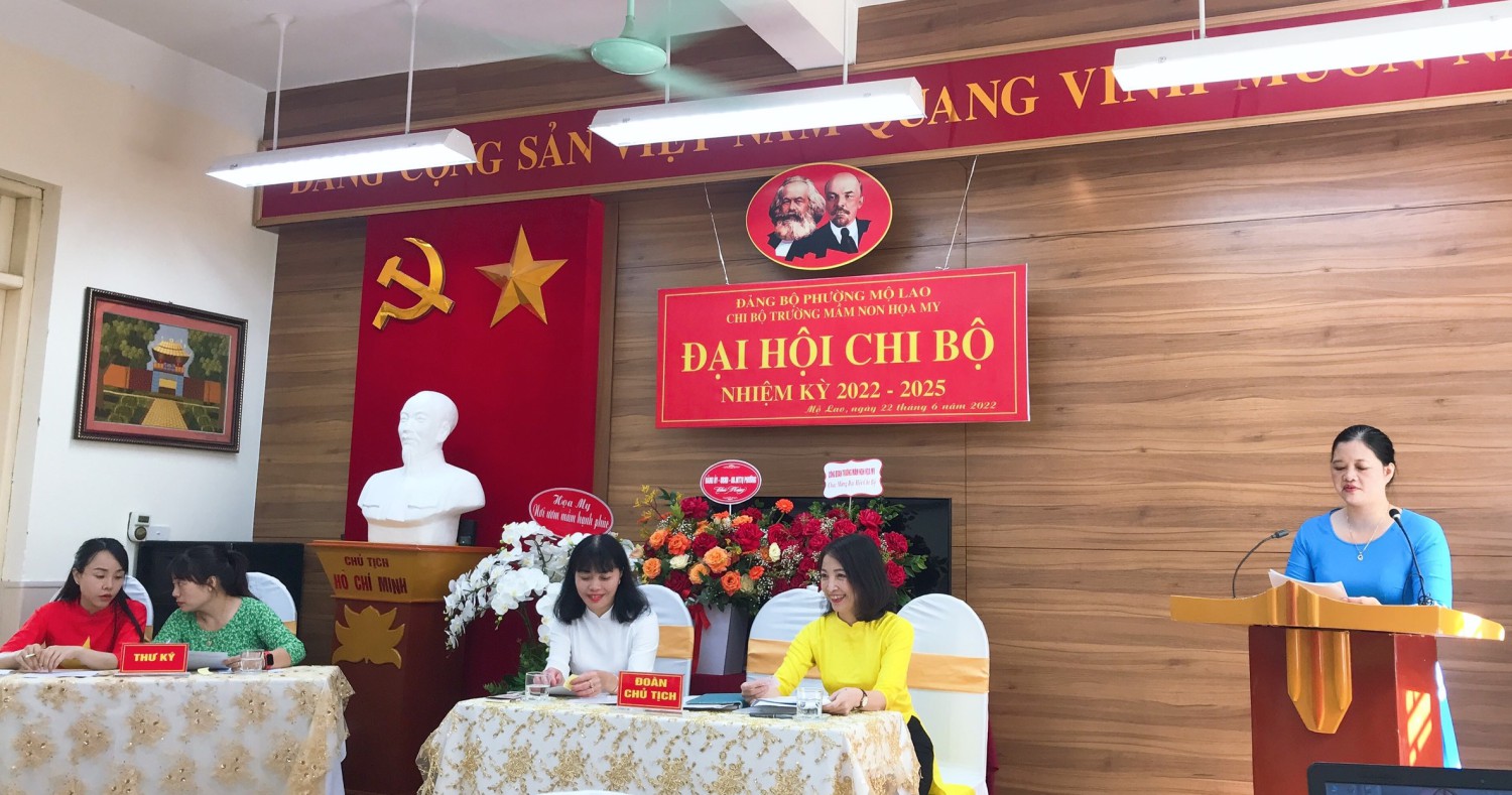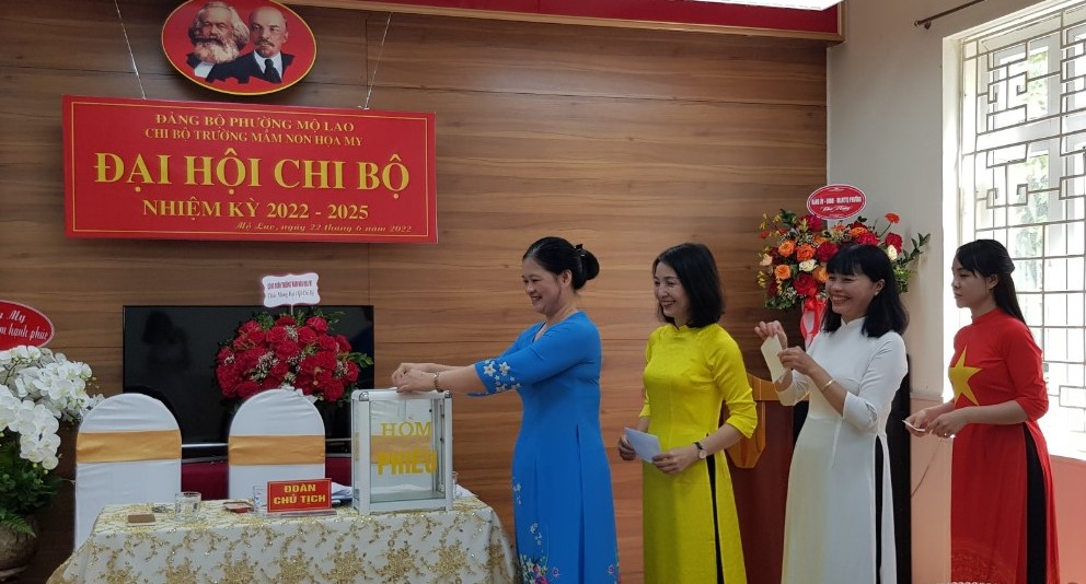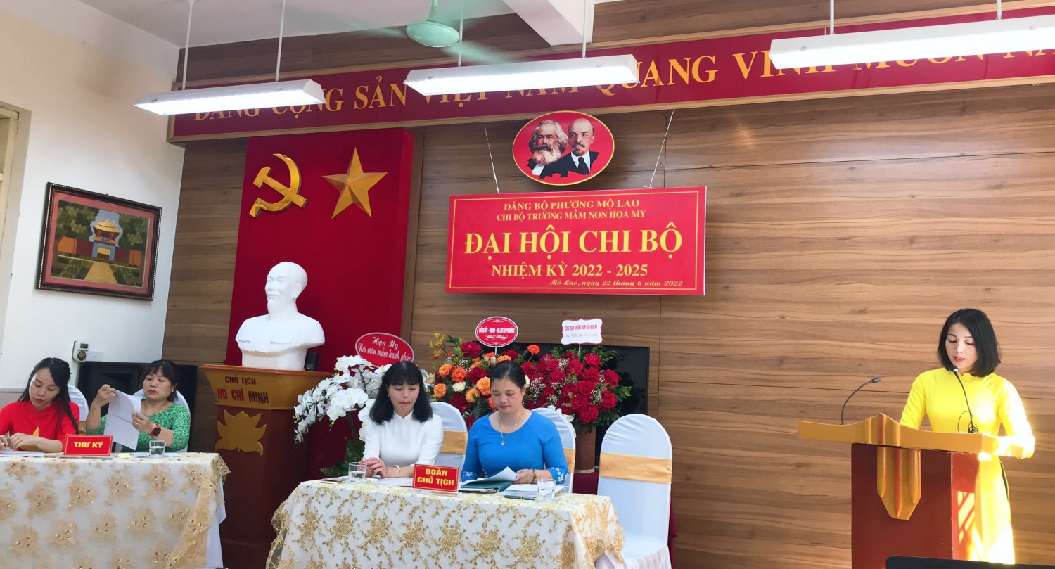 Đại hội đã tiến hành bầu Cấp ủy, Bí thư, phó bí thư Chi bộ nhiệm kỳ 2022-2025: Đồng chí Đào Thị Mây được Đại hội tín nhiệm bầu làm Bí thư chi bộ, đồng chí Nguyễn Thị Liên được Đại hội tín nhiệm bầu là Phó bí thư chi bộ. Với tinh thần làm việc khẩn trương, nghiêm túc và trách nhiệm, Đại hội Chi bộ trường Mầm non Họa My nhiệm kỳ 2022 - 2025 đã thành công tốt đẹp. Tập thể Chi bộ trường mầm non Họa My quyết tâm tổ chức thực hiện đạt hiệu quả tốt các mục tiêu, phương hướng trong nhiệm kỳ tới.