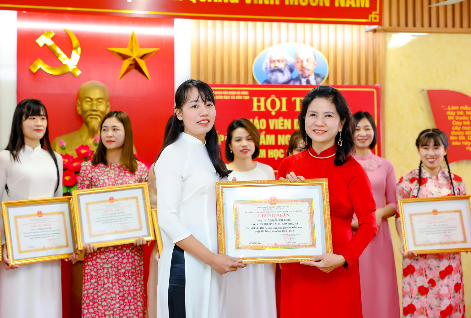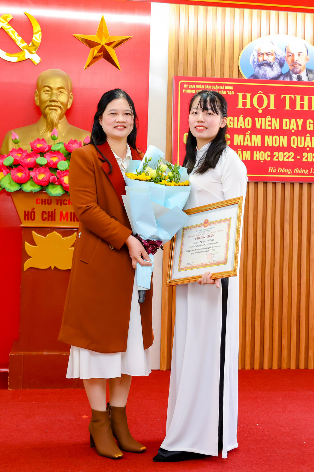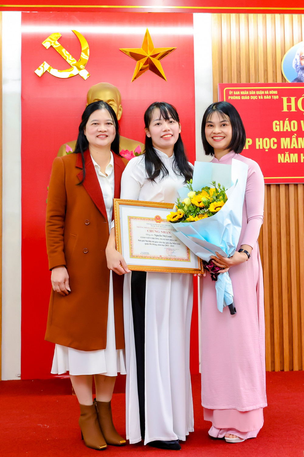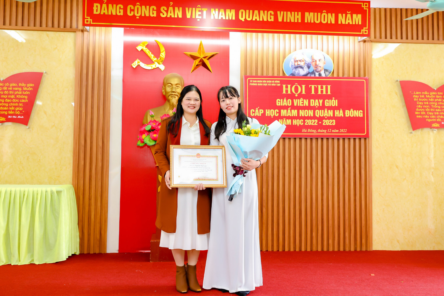 Sáng ngày 23/12/2022 Phòng Giáo dục và Đào tạo quận Hà Đông tổ chức tổng kết Hội thi "Giáo viện dạy giỏi cấp học mầm non quận Hà Đông năm học 2022-2023". Cô giáo Nguyễn Thị Loan đã vinh dự được nhận giải Nhì hội thi. Chúc mừng cô giáo Nguyễn thị Loan! Mong rằng thành tích đáng tự hào này sẽ là động lực để cô tiếp tục cố gắng và thành công hơn nữa trong sự nghiệp trồng người.