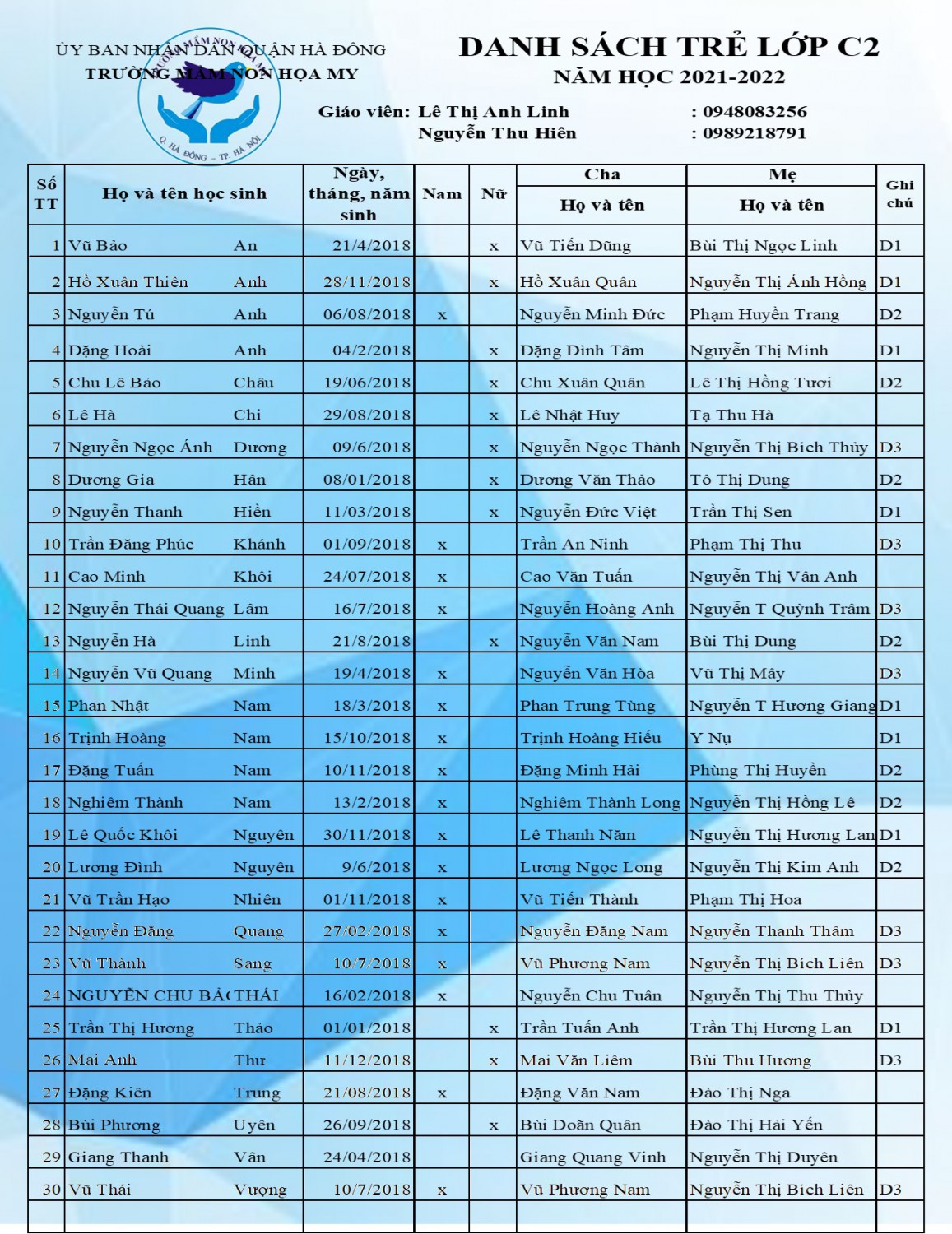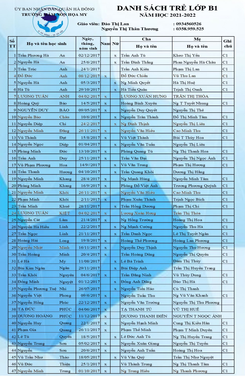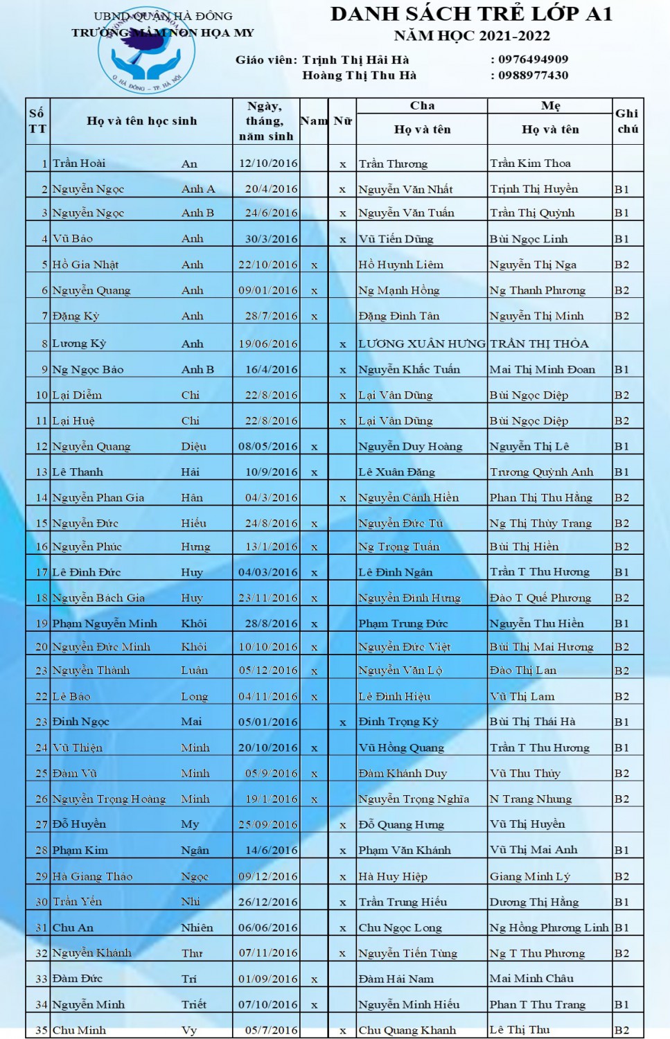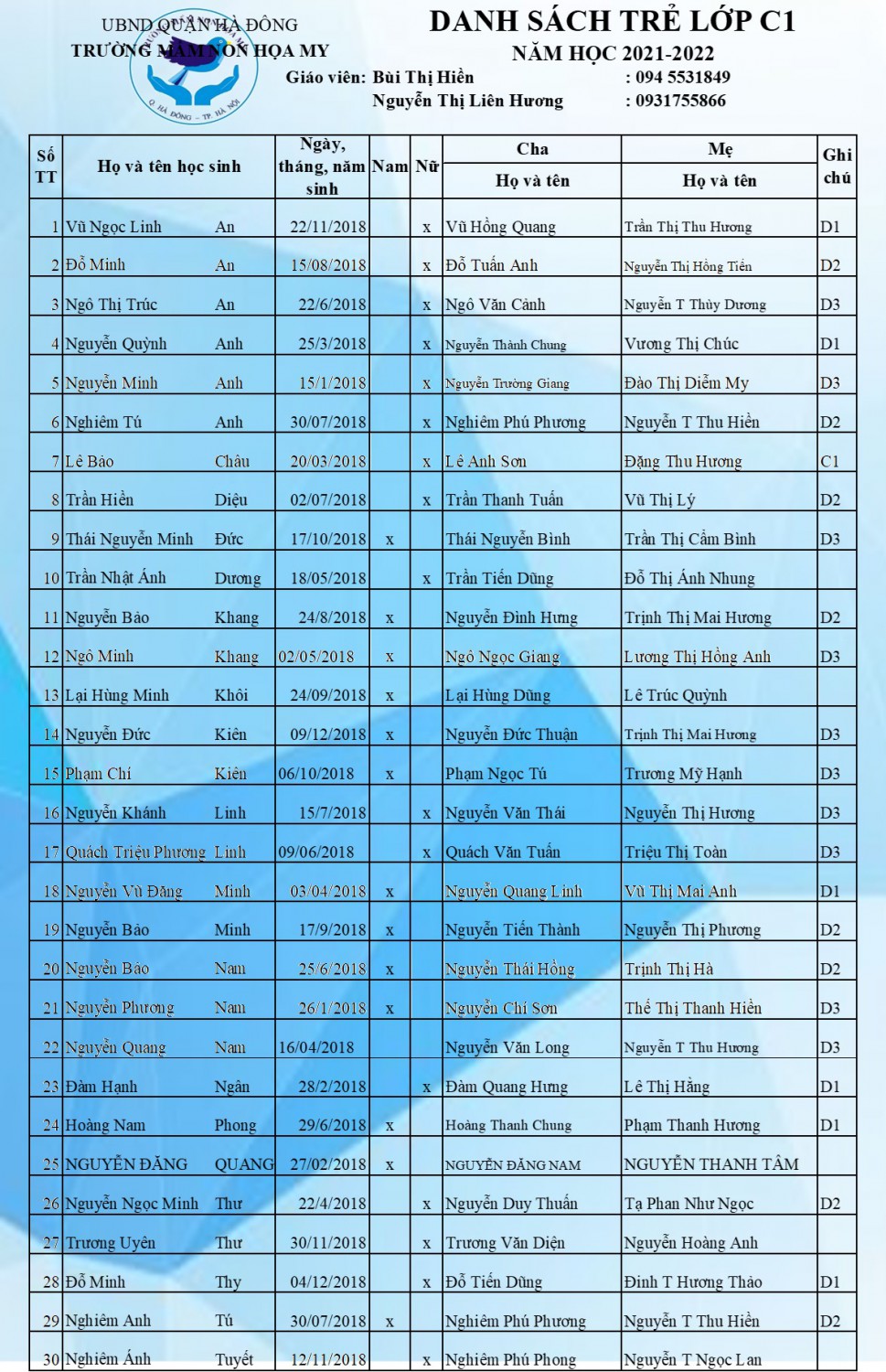 Dưới đây là kết quả tuyển sinh, danh sách các lớp, giáo viên chủ nhiệm năm học 2021-2022: