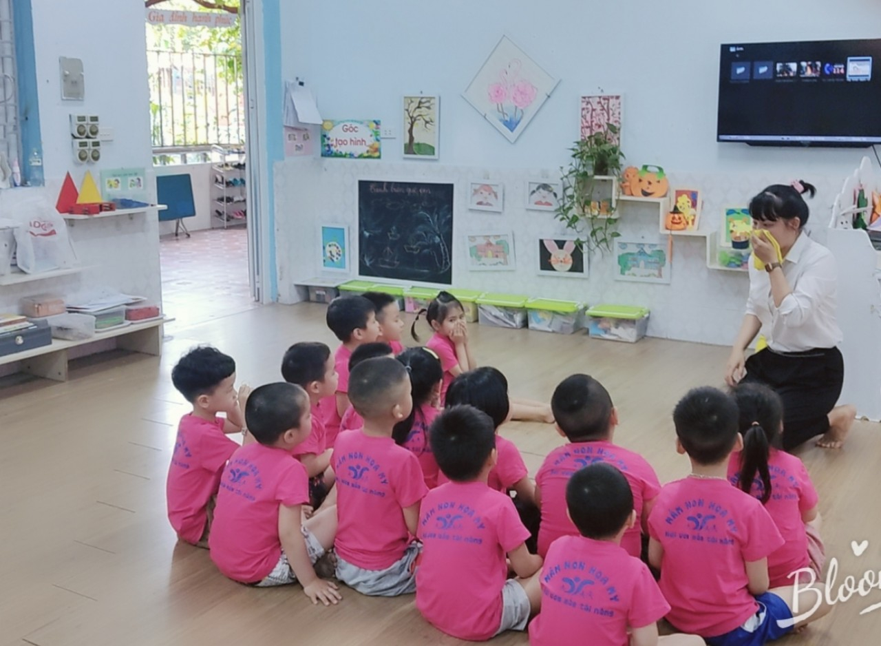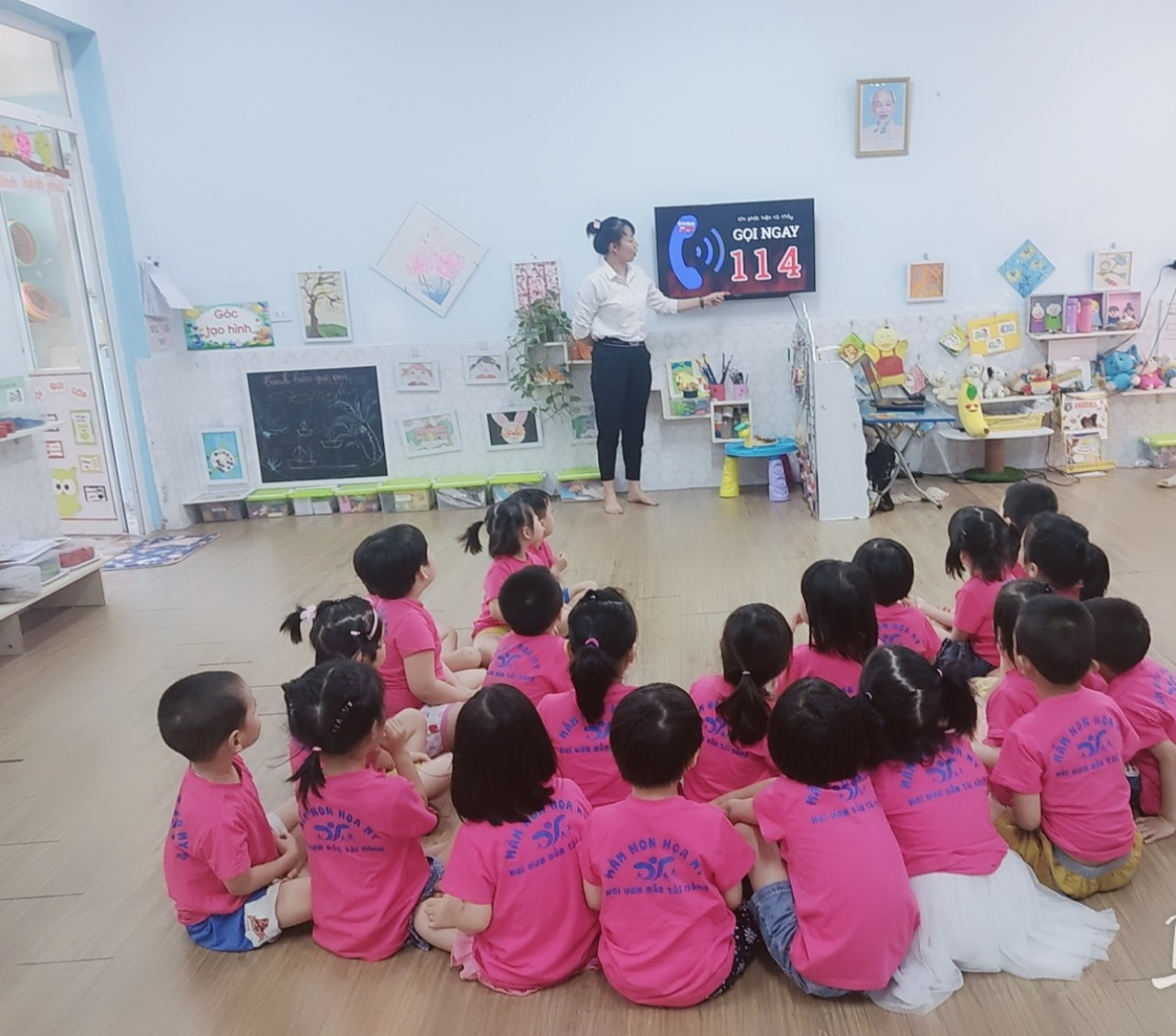 Cô trò lớp B2 trường mầm non Họa My trò chuyện về sự nguy hiểm khi gặp hoả hoạn và nhắc trẻ cần bình tĩnh.