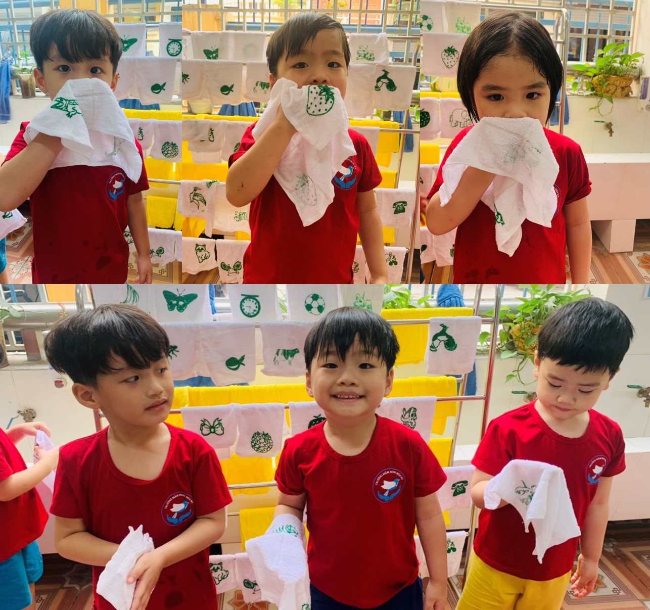 - Dạy trẻ biết chùi mũi bằng khăn, khi ho và hắt hơi dùng khăn hoặc dùng tay che miệng. Không khạc nhổ bừa ra lớp, đi đại tiện, tiểu tiện phải vào nhà vệ sinh;