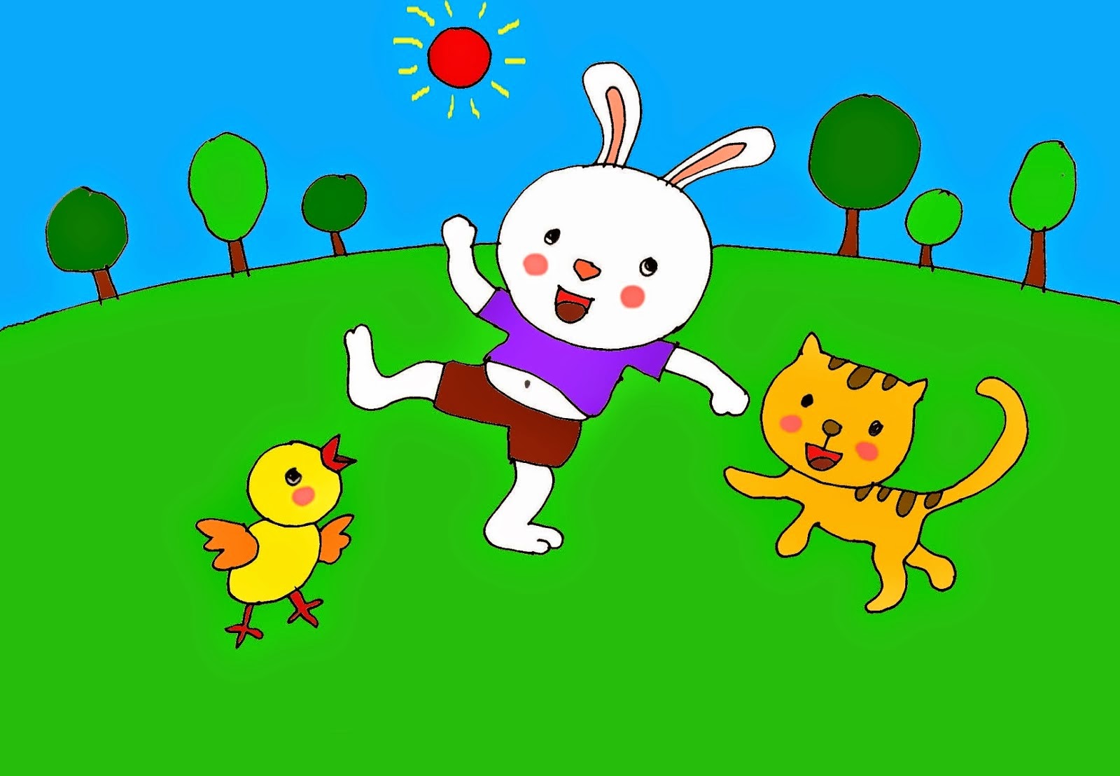 Lát sau mưa tạnh, mặt trời sáng tỏ, Thỏ Trắng và Gà con, Mèo con cùng chơi đùa dưới nắng ấm.
