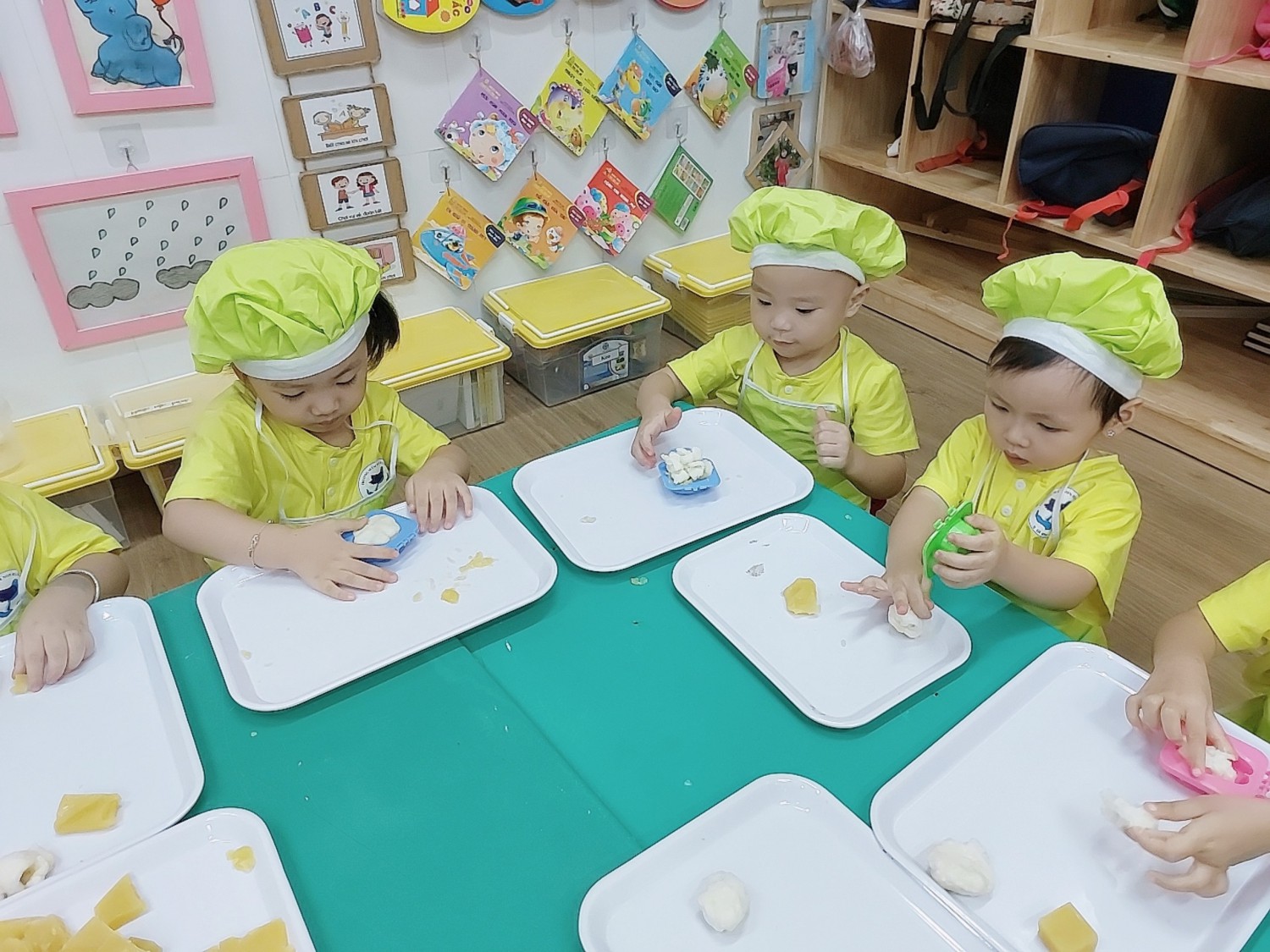 Cô giáo đã chuẩn bị các nguyên liệu: bột bánh, các loại khuôn ngộ nghĩnh cho các con được tham gia trải nghiệm.
