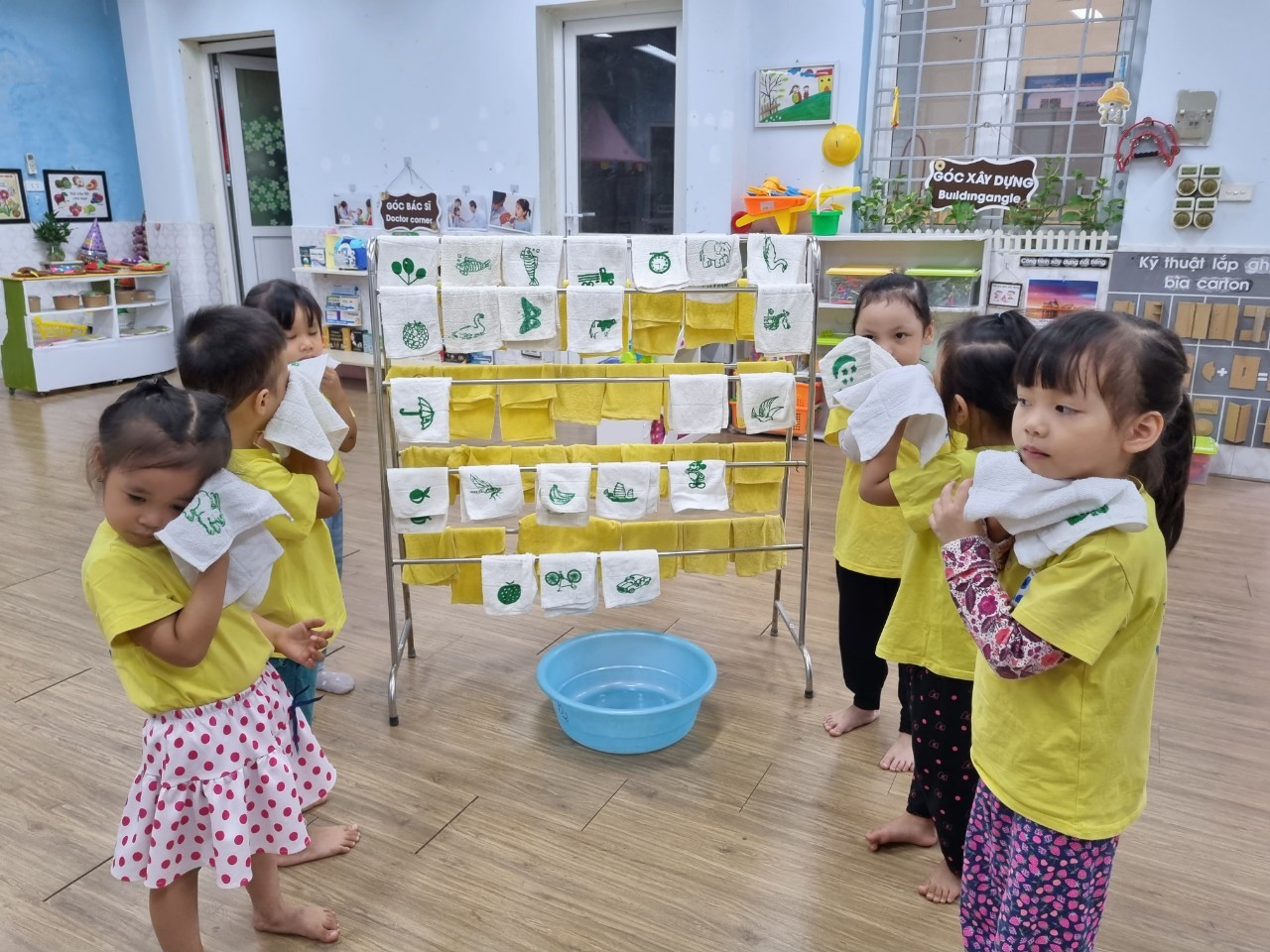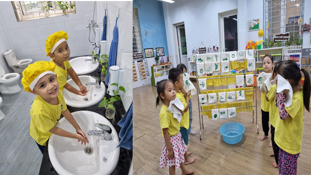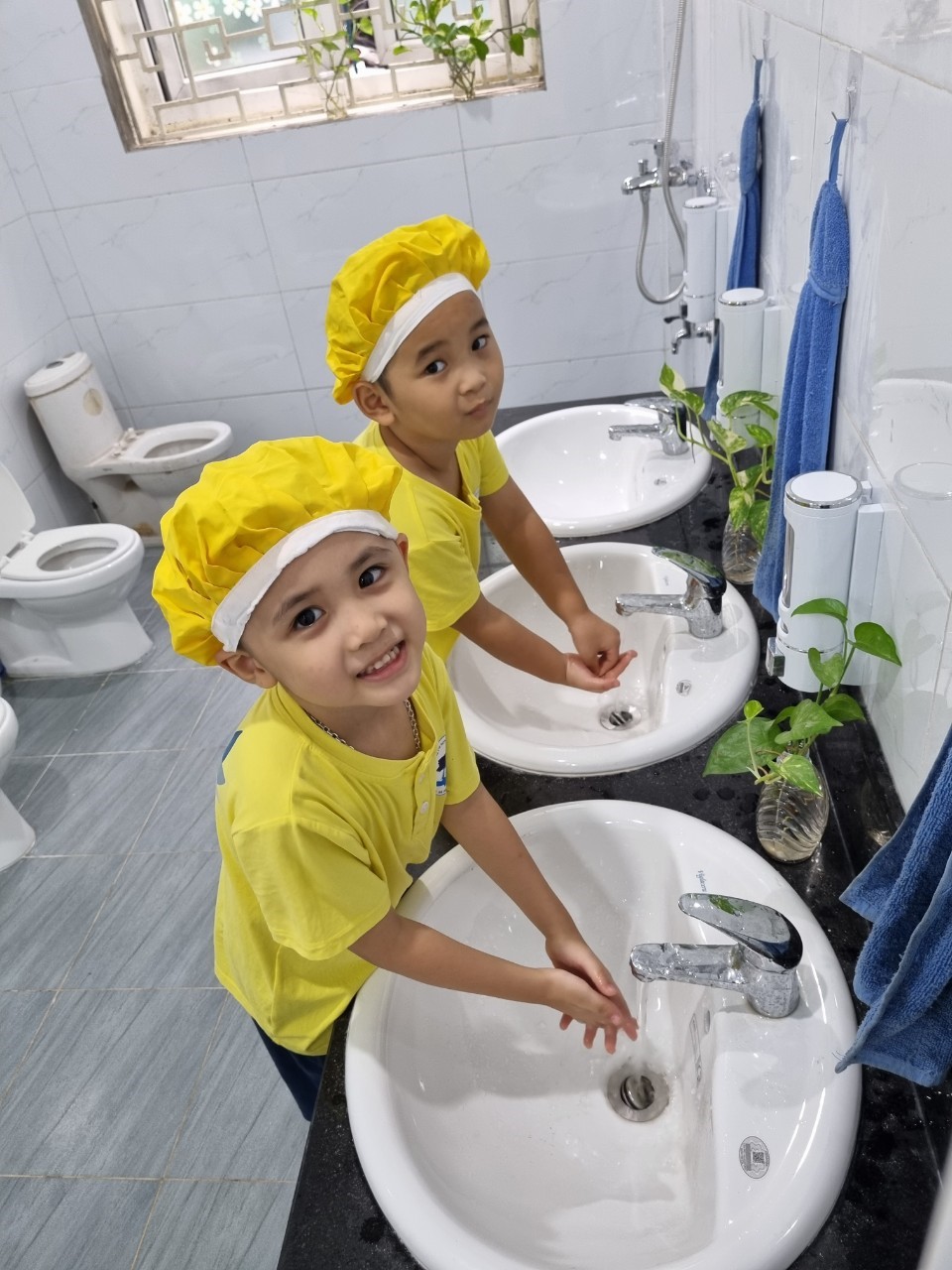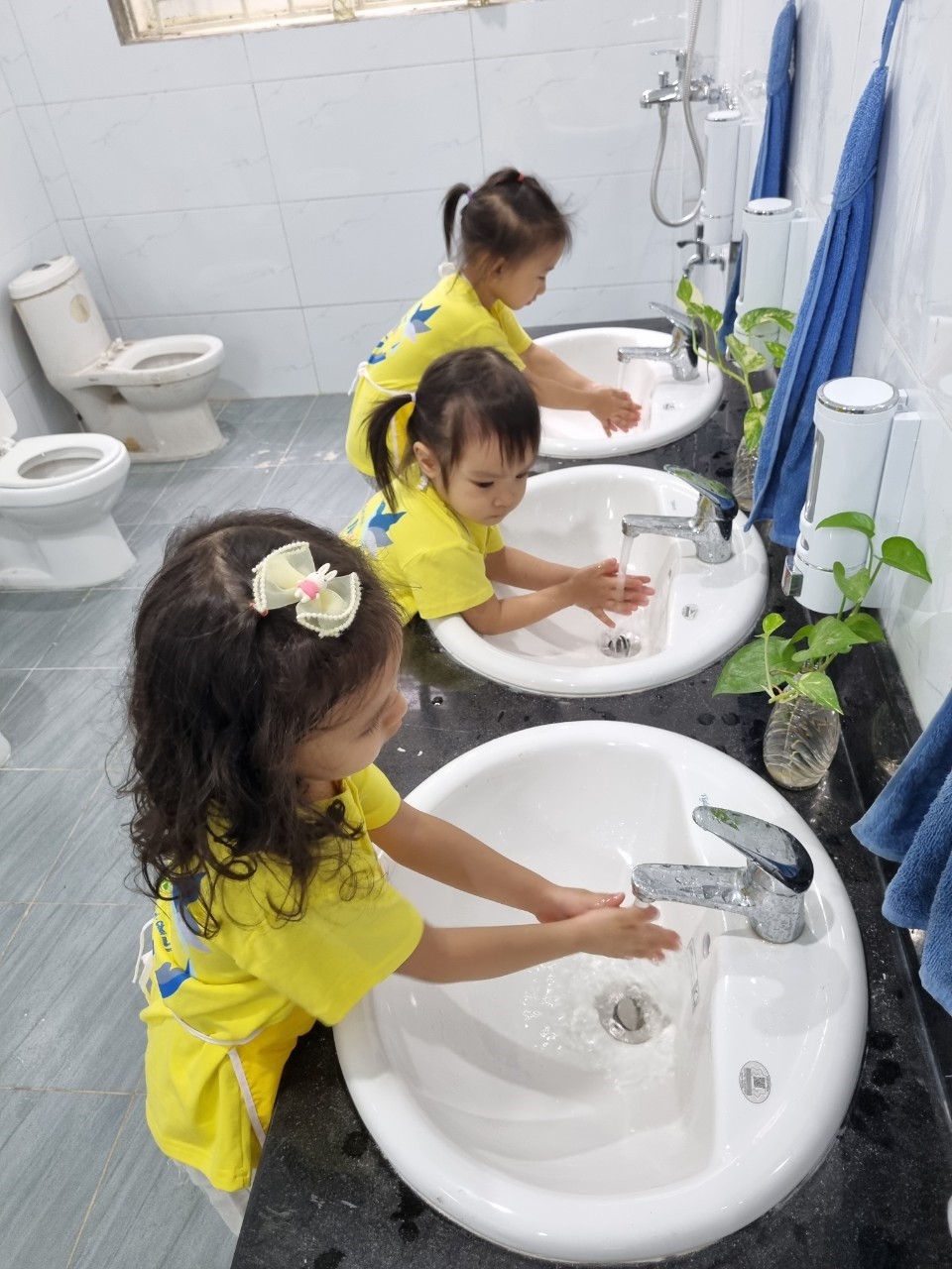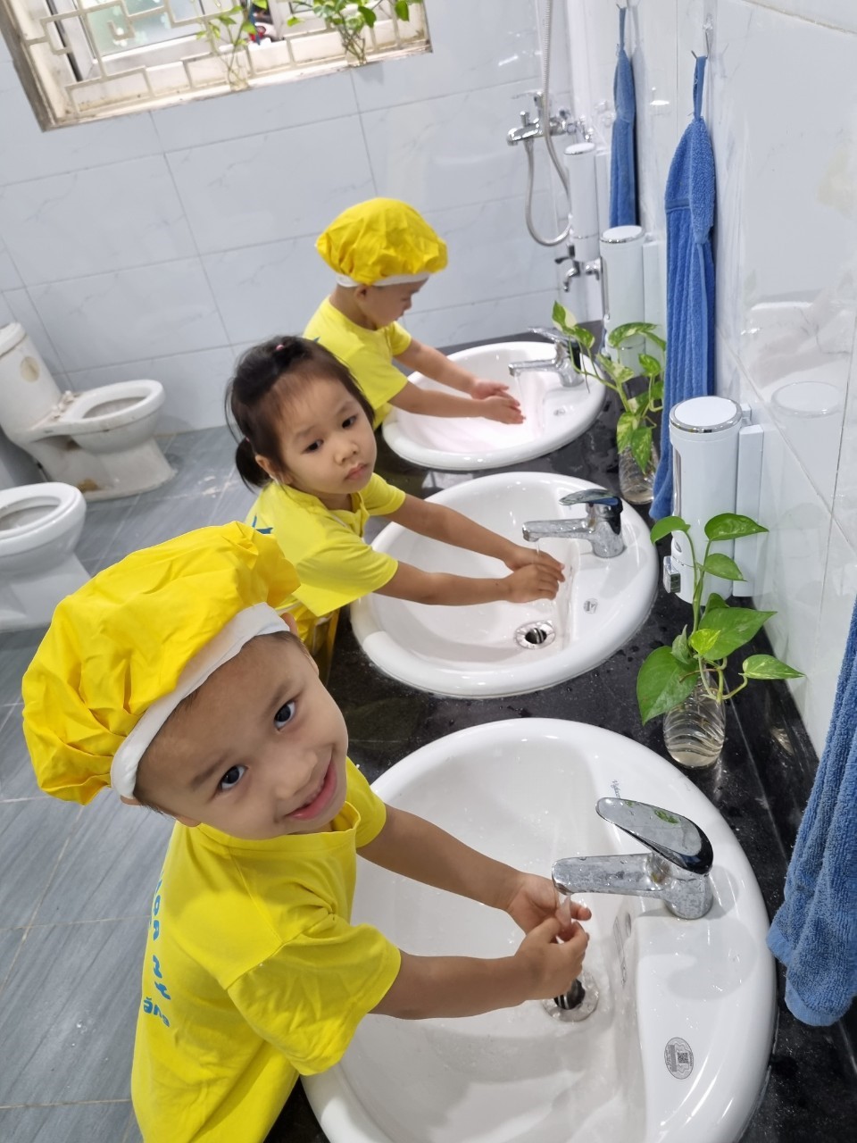 Ngày nào cũng được thực hành nên chúng tớ đều biết thực hiện đúng các thao tác rửa tay để đôi tay luôn sạch sẽ